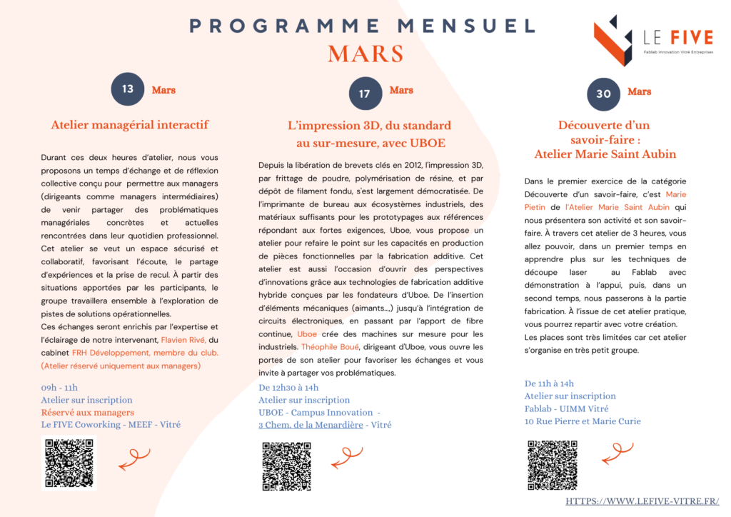 Retrouvez ci-dessous les ateliers qui vous attendent au mois de mars au Five :